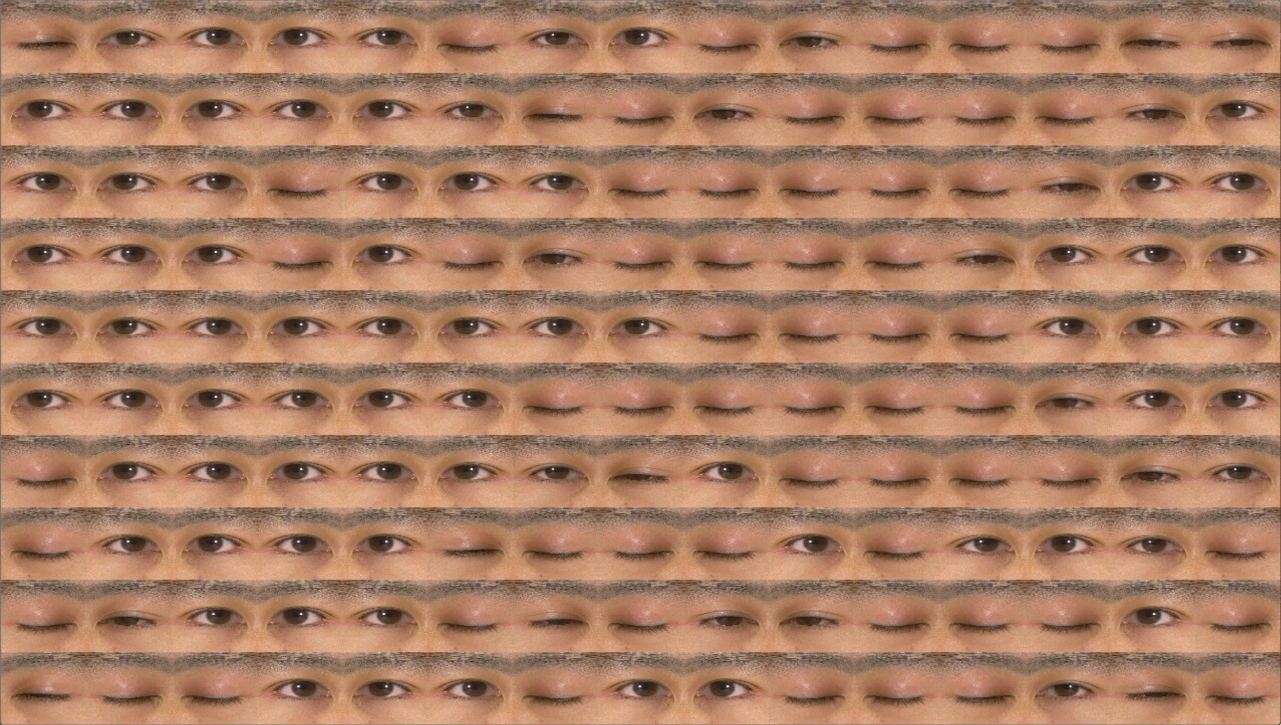 A software generated animation that consists of a matrix of eyes that open and close by taking stock of their neighbors’ actions. Sometimes they want to be like their neighbors other times they decide against it. © George Legrady